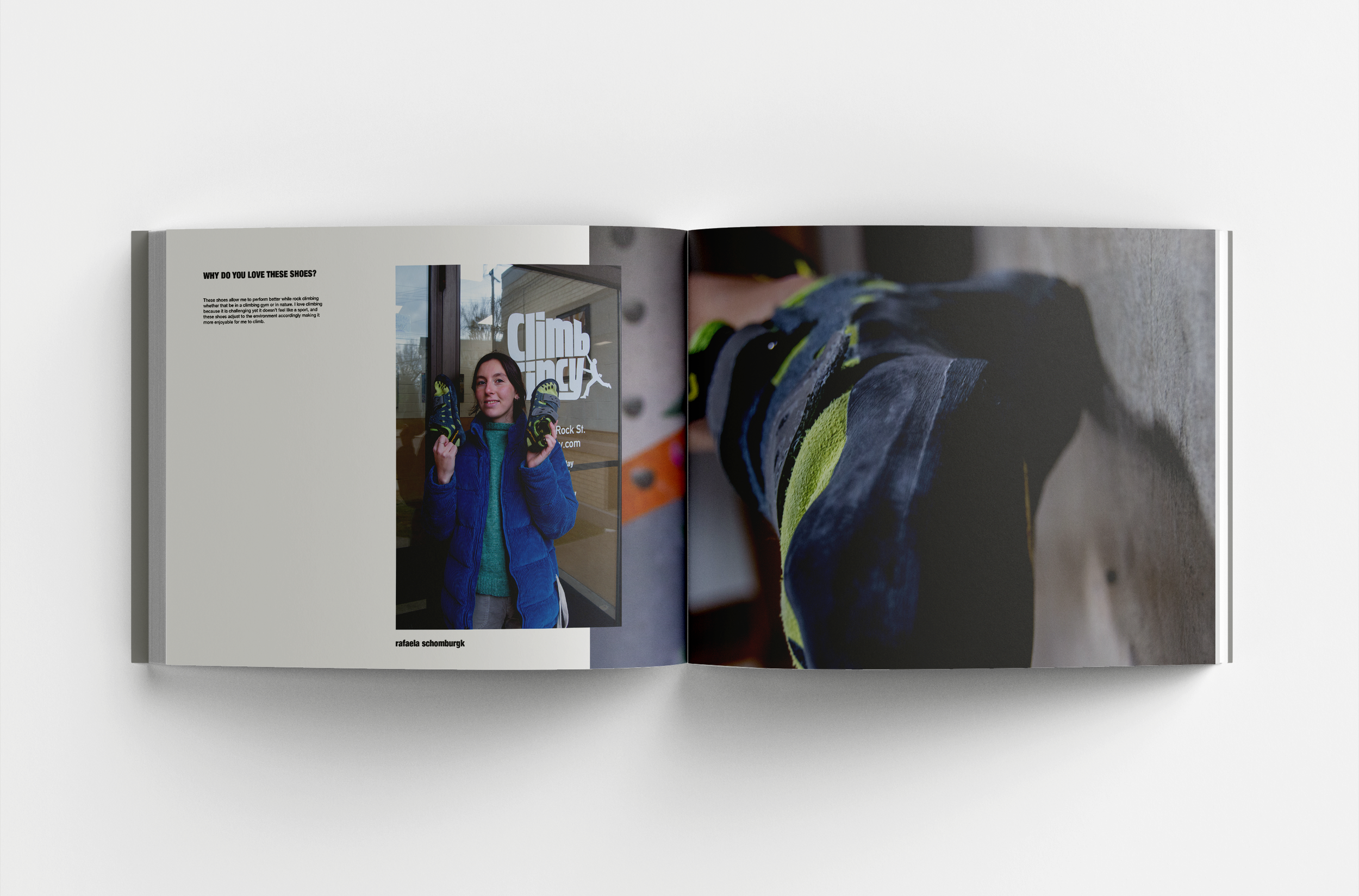 This book was engineered through purposeful construction to introduce the main individuals and choice of shoe without giving any context. Intended to make the audience curious about who the people are and what the specific shoe potentially means to that individual.